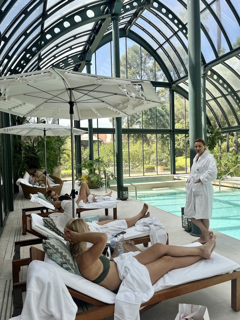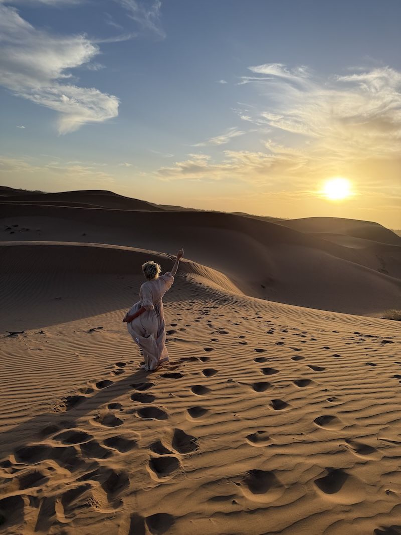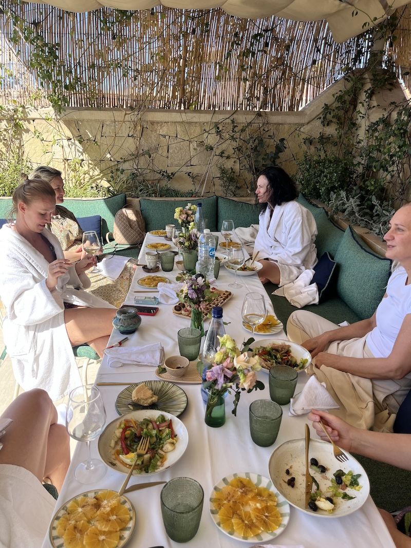 Nothing. Deliberately. A terrace. The sky turning gold over Marrakech. Perhaps a conversation. Perhaps silence. Perhaps the sound of the muezzin — not as religion, but as a frequency your nervous system recognises as ancient, safe, and whole. Dinner when the body is ready. Not before.